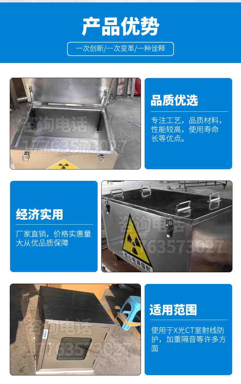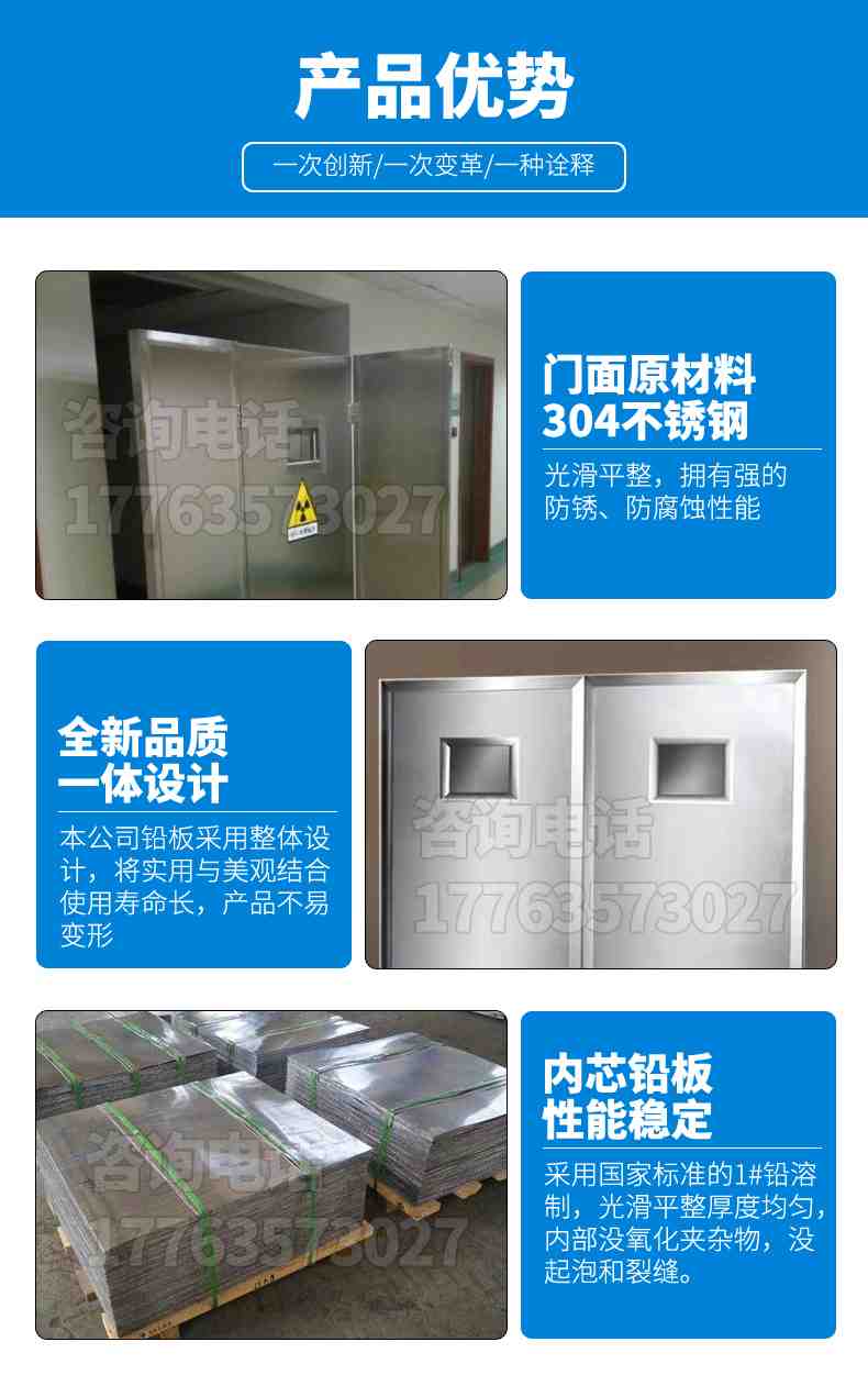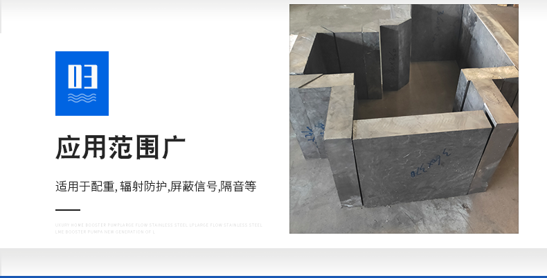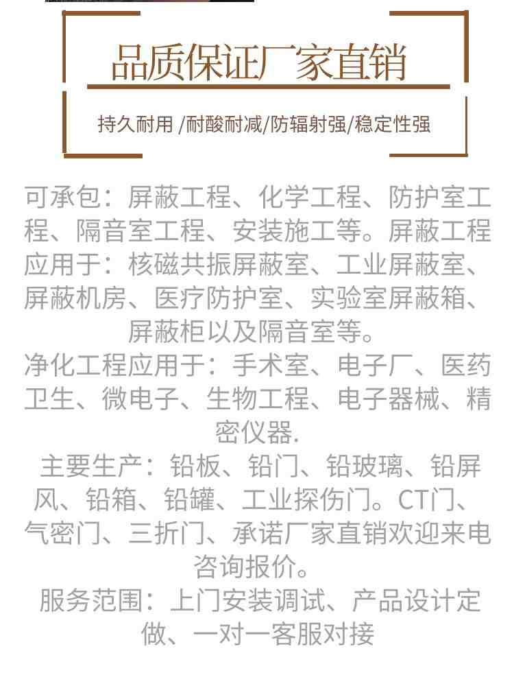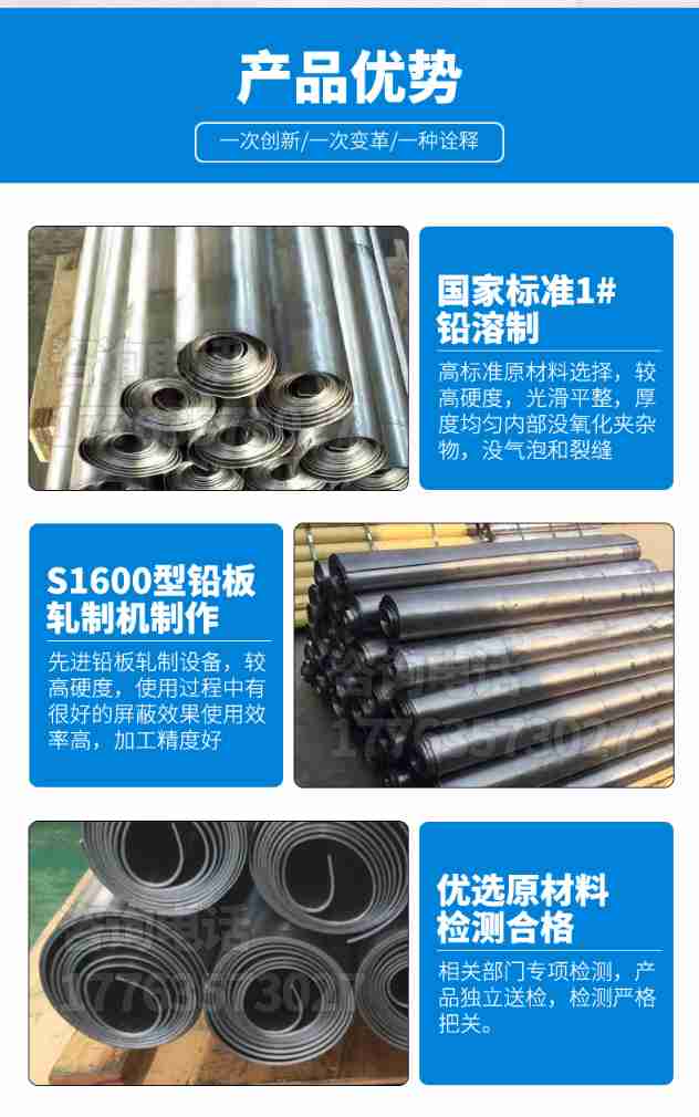 本公司生产的铅产品,专业性强,实力雄厚,从事专业铅门,医用铅门,,铅板,医用射线防护铅板,铅锭,铅块,铅砖,配重铅块,硫酸钡沙,医用射线防护钡沙,铅玻璃,铅玻璃, 研究、开发、生产,销售安装综合性企业。公司主要生产医疗射线防护器材产品系列,工业探伤防护产品系列,辐射防护工程和产品遍布全国二十多个省、市、自治区,达到国家射线防护标准。其中铅铅板有1.5mm铅板,2mm铅板,2.5mm铅板,3mm铅板,4mm铅板,5mm铅板,6mm铅板,7mm铅板,8mm铅板,9mm铅板,10mm铅板,12mm铅板,15mm铅板,20mm铅板,30mm铅板,50mm铅板等多种规格。企业严把质量关,做到不合格不出厂,公司可根据客户需要定尺加工。
